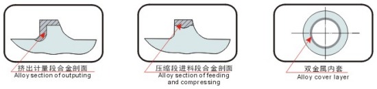 雙合金機(jī)筒就是在機(jī)筒內(nèi)壁澆鑄一層2-3mm的耐磨、耐腐蝕、耐高溫的合金。其有效使用壽命比普通氮化機(jī)筒大大提高,對(duì)于加工工程塑料、氟塑料、聚砜、PPO特殊類型的塑料等,雙合金的優(yōu)越性尤為明顯。